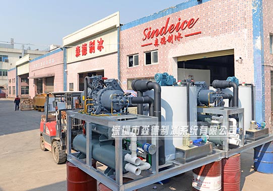 片冰機通電運行,制冷劑(冷媒)通過壓縮機的做功變成高溫高壓的蒸汽工質(zhì),再流入冷凝器與外界換熱,放出熱量變成高壓液態(tài)工質(zhì),流經(jīng)過濾器過濾后通過膨脹閥降壓降溫為汽液混合狀態(tài),然后進(jìn)入蒸發(fā)器,與片冰機蒸發(fā)器內(nèi)壁上的水進(jìn)行熱交換,吸收大量的熱,使水急劇降到結(jié)冰點以下溫度,瞬速結(jié)冰。此時制冷劑經(jīng)過吸收熱量后蒸發(fā)成為氣態(tài),被吸入壓縮機內(nèi)進(jìn)行循環(huán),從而實現(xiàn)循環(huán)制冷。